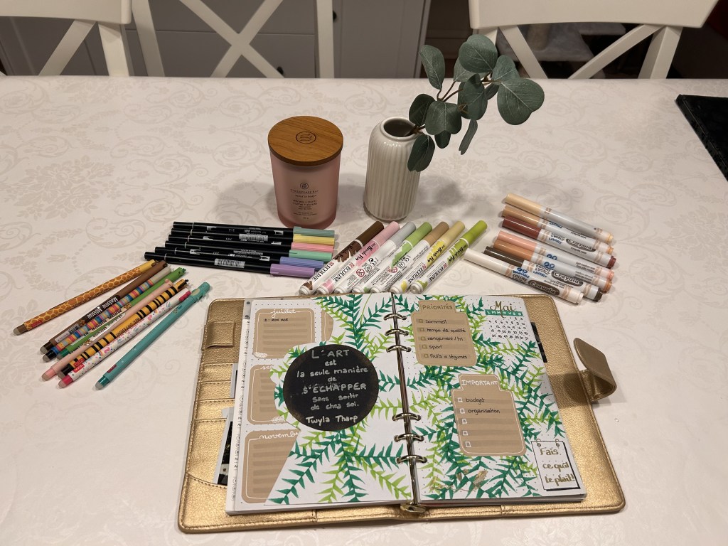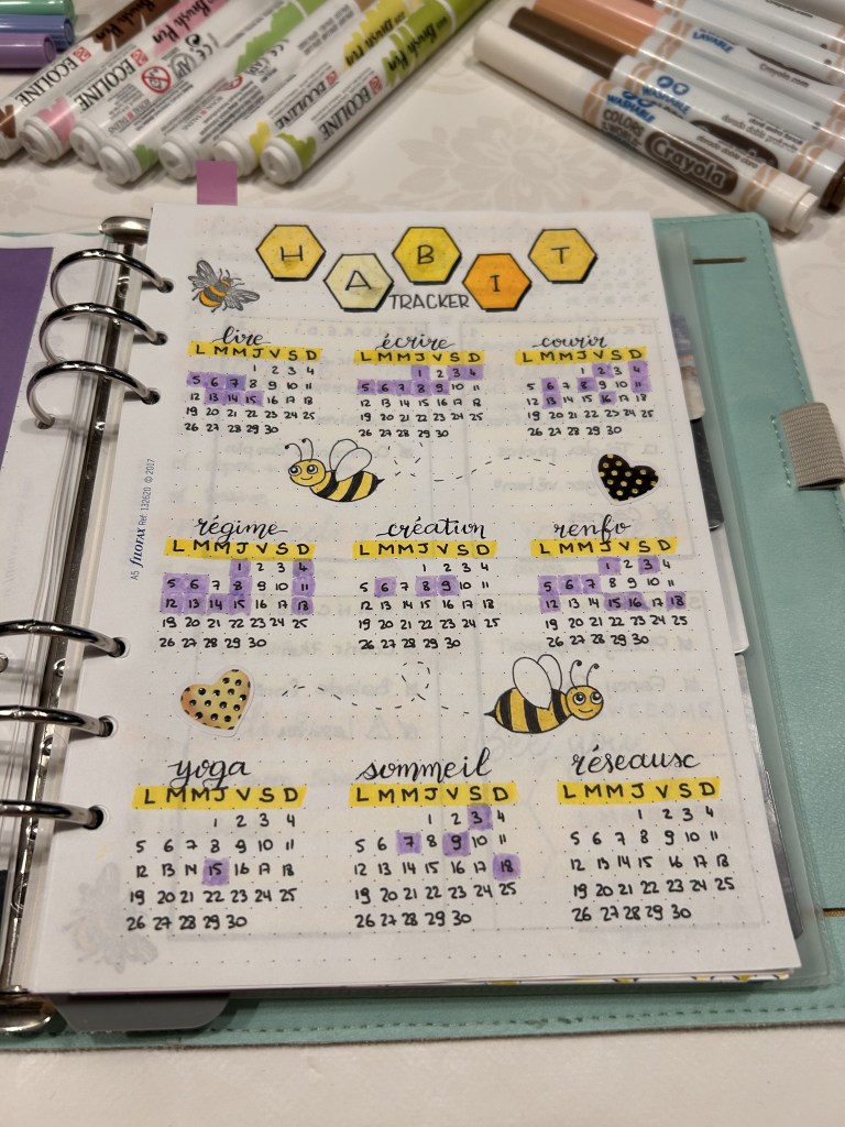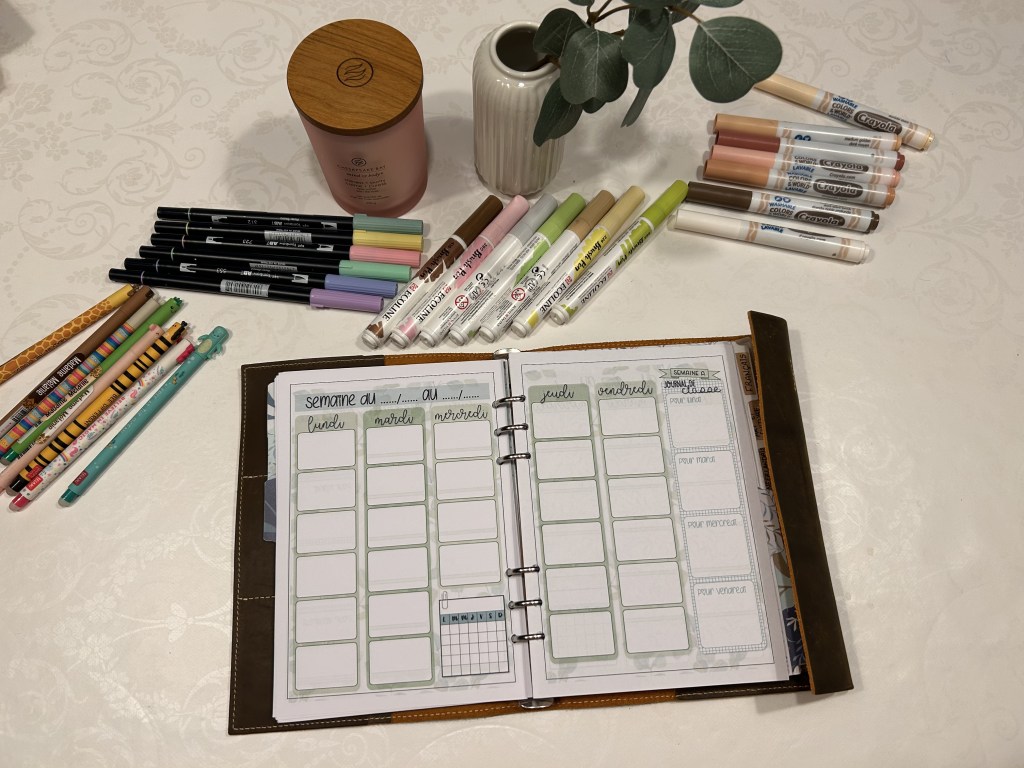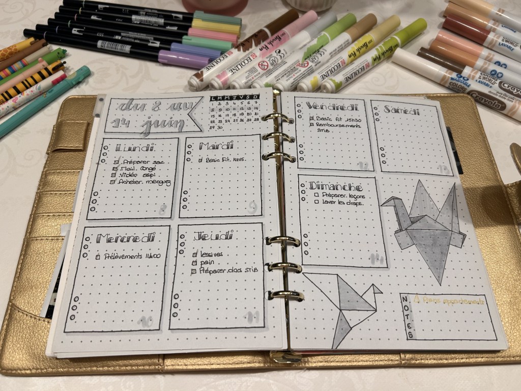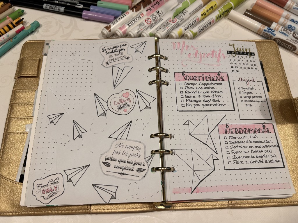 Si tu as envie, tu peux décorer ton carnet pour le rendre attrayant ou simplement pour prendre un moment pour te détendre. Cela peut sembler être une perte de temps. Mon conjoint ou mes collègues étaient souvent perplexes face au temps que me prenait l’organisation et la mise en page de mes carnets. Mais pour moi, c’est un moment de détente et de réflexion. C’est un moment au cours duquel je me projette et fais le point sur ce que je vis et ce dont j’ai besoin.