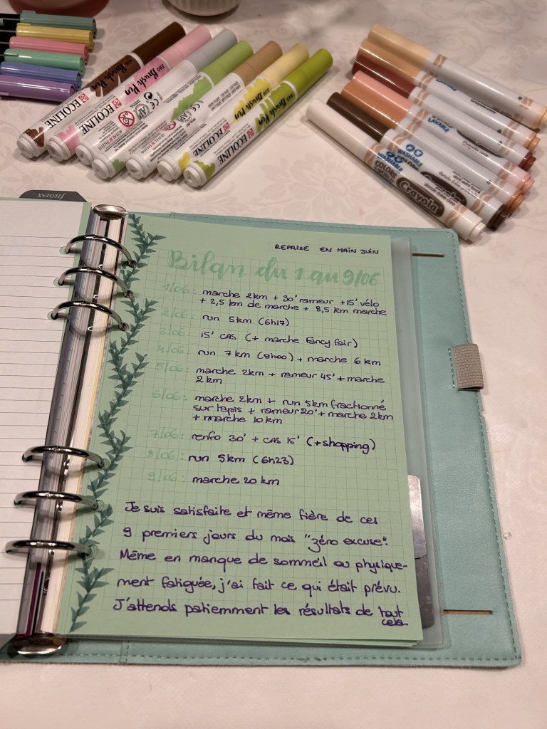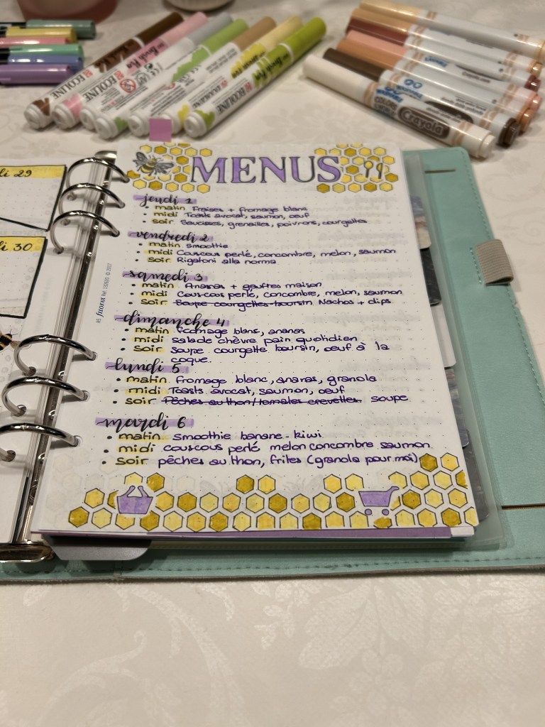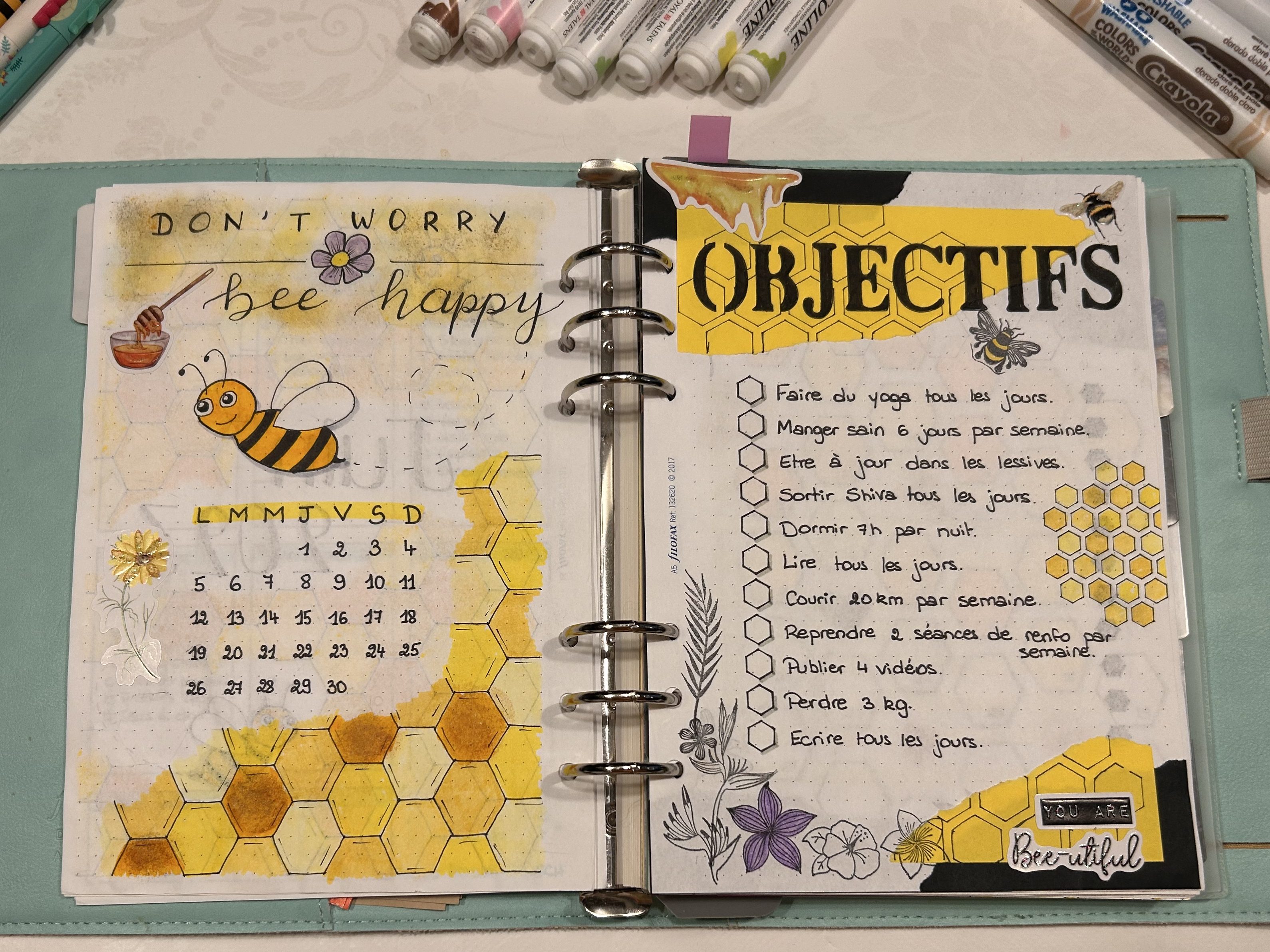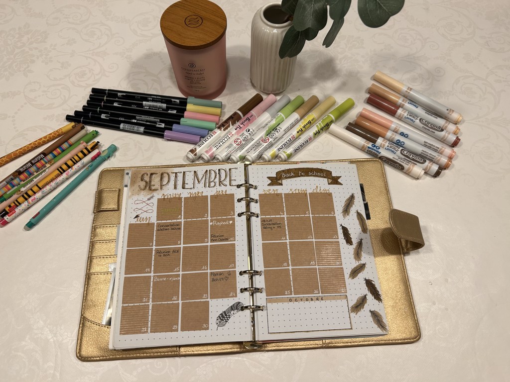 Si tu as envie, tu peux décorer ton carnet pour le rendre attrayant ou simplement pour prendre un moment pour te détendre. Cela peut sembler être une perte de temps. Mon conjoint ou mes collègues étaient souvent perplexes face au temps que me prenait l’organisation et la mise en page de mes carnets. Mais pour moi, c’est un moment de détente et de réflexion. C’est un moment au cours duquel je me projette et fais le point sur ce que je vis et ce dont j’ai besoin.