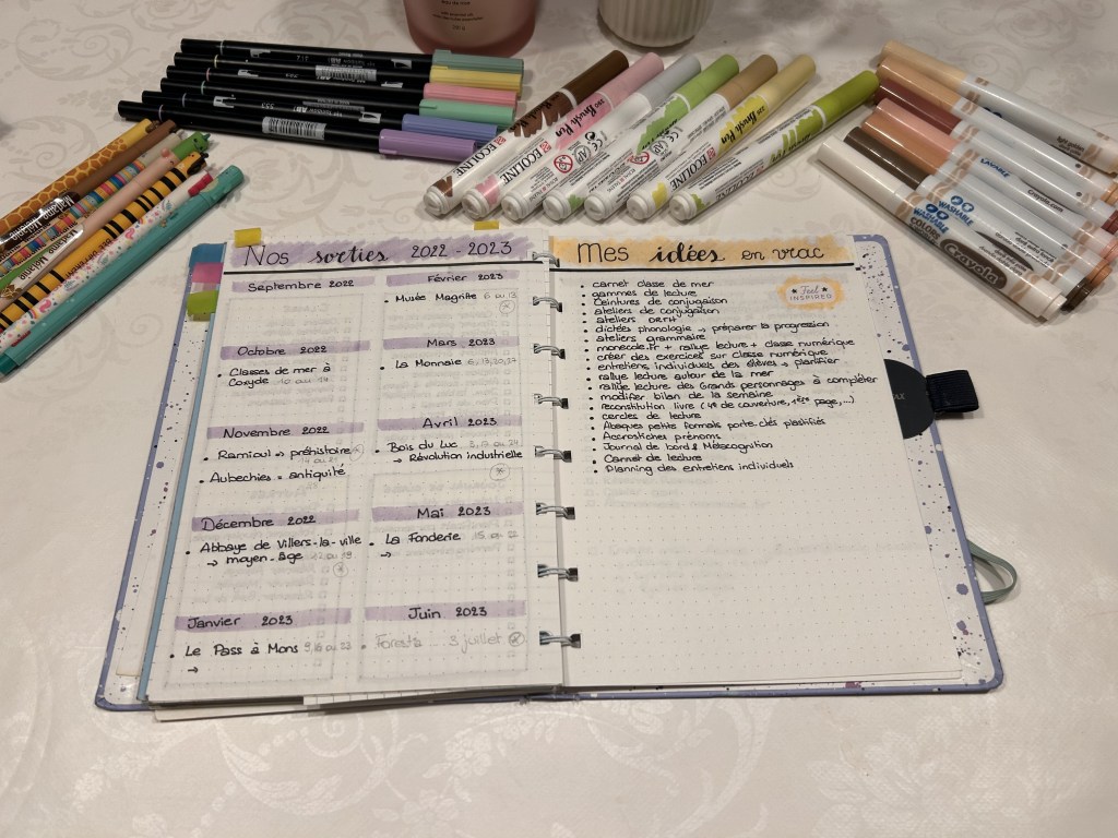 Dernièrement d’ailleurs, les bouleversements de ma vie ont fait que ceux que j’avais ne sont plus adaptés (le plus utilisé était mon journal de classe, entièrement conçu pour ma pratique d’enseignante…). J’ai un peu tout mélangé (j’ai, notamment, mis ma théorie de guitare dans mon journal d’écriture…) et je dois réorganiser tout cela. La bonne nouvelle est que j’adore « réorganiser mes journaux d’organisation »… 😅 La mauvaise, c’est qu’en attendant je ne suis pas organisée… Forcément…